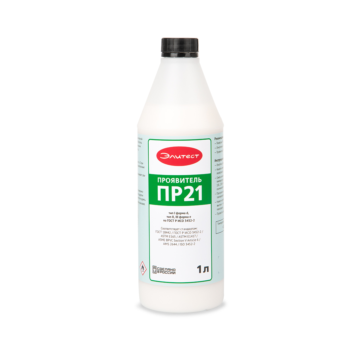 Элитест ПР21 — суспензионный проявитель на основе растворителей. Проявитель обладает высокими сорбционными свойствами, благодаря чему хорошо вытягивает находящийся в полости дефекта пенетрант. Легко наносится на поверхность, ложась ровным тонким слоем и создавая однородный белый фон.